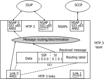 Only the link type of the incoming link and the service indicator portion of the SIO (service information octet) in the incoming message are used to choose the NSAP to receive the incoming message; the sub-service field of the SIO octet (national/international indicator and optional message priority) is not used.