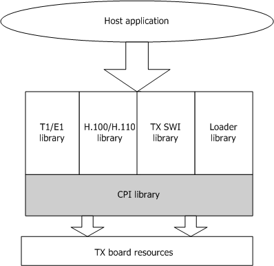 The TX host application development environment (shown in the following illustration) consists of libraries that enable you to configure and control the protocol engines loaded on the TX board. This manual describes the CPI library.