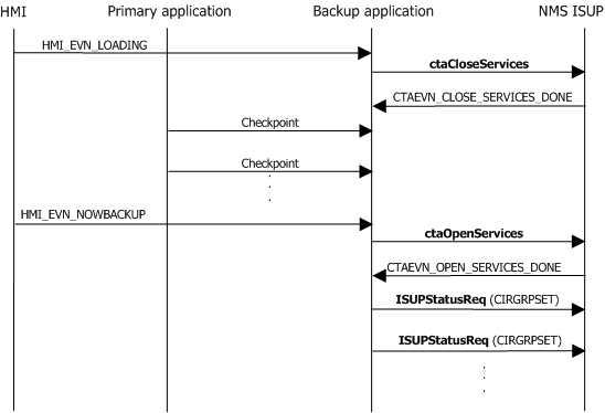 Upon notification that the backup board was reloaded and set to backup, the backup application reopens the ISUP or TUP service. In the case of ISUP, the backup application checkpoints the state of all circuits to the ISUP stack running on the backup board.