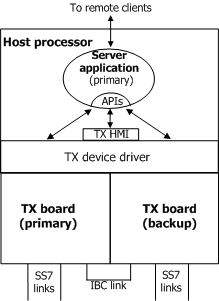 A single-node configuration uses two TX boards in a single-node (chassis) for board level redundancy. In this configuration, a single application monitors and controls the primary and backup boards and performs all other application functions. This is the simplest migration path for an existing non-redundant application to a redundant signaling subsystem.