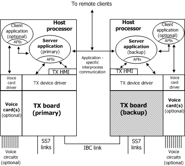 A dual-node configuration uses two chassis, each with a single TX board for signaling. The dual-node model assumes a signaling server application that, like the TX boards, operates in a primary and backup manner. The primary and backup server applications communicate call states through an application-specific inter-process communication (IPC) mechanism.