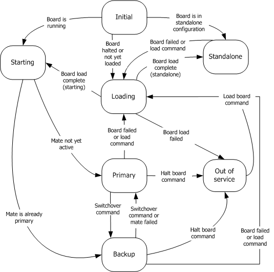 The behavior of each signaling node, as implemented through the RMG demonstration program, is modeled as a finite state machine where the state of each node is determined by external events such as board failures, signaling node failures, and user commands. The RMG state model is shown in the following illustration.