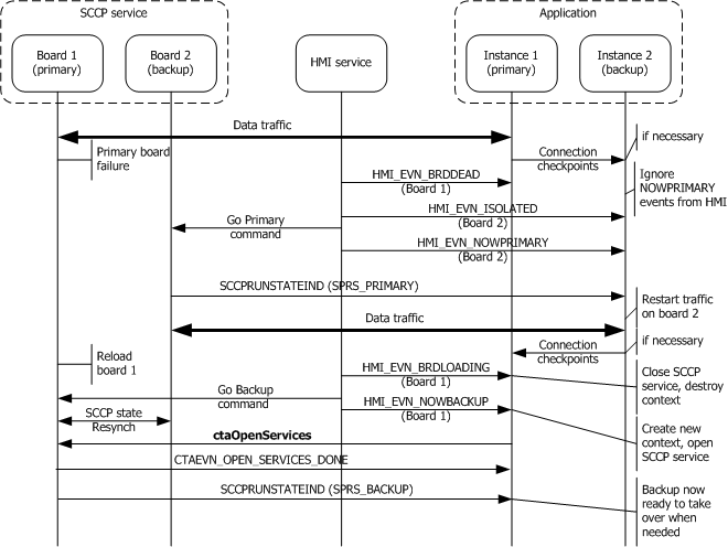 However, in a failure case, the failed board must be reloaded and placed into the backup state. The application must close the SCCP service and destroy the context associated with the failed board. Once the failed board is reloaded, the application (instance) must create a new context and re-open the SCCP service on the reloaded board.