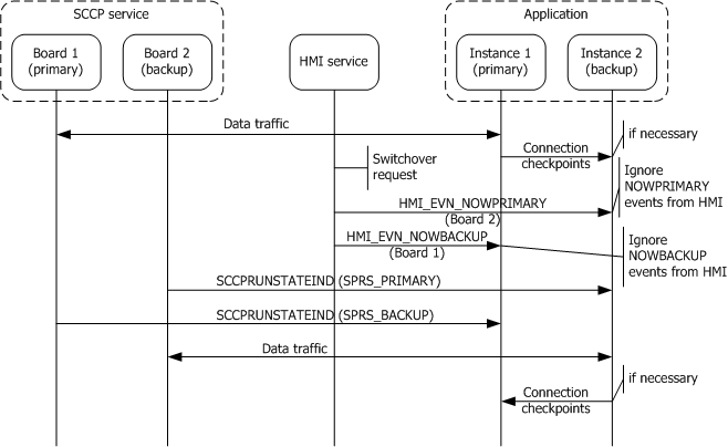 For a single-node application that opens both boards, the application receives a SCCPRUNSTATEIND event (SPRS_PRIMARY) for the previously backup board and a SCCPRUNSTATEIND event (SPRS_BACKUP) for the previously primary board. These event indications can occur in either order, depending on how the switchover was initiated. For a dual-node architecture, the application instance receives only the new run state indication for its own board.