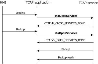 When the Health Management service backup indication is received, the TCAP application can reopen the TCAP service to the board. A backup run state indication is received from the TCAP service after the open service is completed.