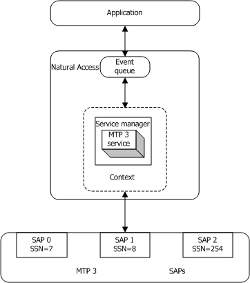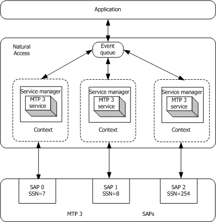 For a single threaded application that uses multiple MTP 3 SAPs (multiple MTP 3 subsystems), a multiple context, single queue model is recommended. The application has a single event loop with events from all SAPs delivered through the same queue. The application determines which SAP a particular event is associated with from a service user ID (suID) value returned with each event.