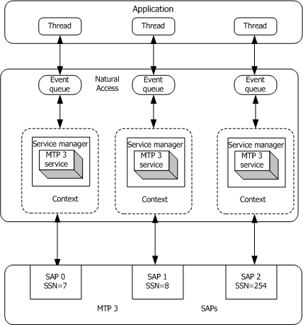 For multi-threaded applications using multiple MTP 3 SAPs (one per thread), a multiple context, multiple queue model is recommended. Each thread has its own independent event loop, receiving only the events associated with its MTP 3 SAP on its Natural Access queue.