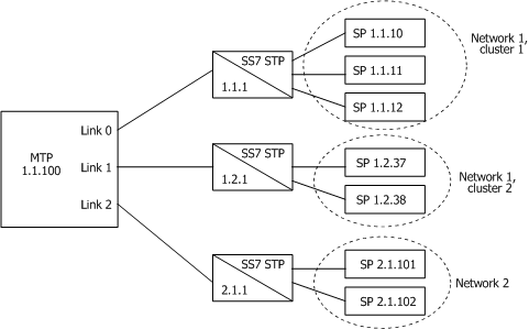 Use routing masks to implement network and cluster routing in ANSI networks. In the following example, rather than specifying explicit routes to each of the seven remote SPs, routing masks and routes are used. All point codes and routing masks, regardless of point code length, are stored internally as 32-bit unsigned integers.