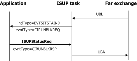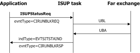 If the far exchange initiates the unblocking of the circuit, the application receives a status indication (EVTSITSTAIND) with the event type of CIRUNBLKREQ from the ISUP layer. The application then acknowledges the circuit unblocking by invoking ISUPStatusReq with the event type of CIRUNBLKRSP.