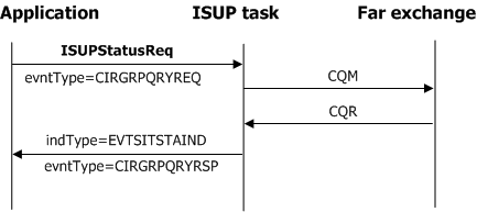 The application initiates a circuit group query by invoking ISUPStatusReq with the event type of CIRGRPQRYREQ. The application is notified of the completion of the group query request (the receipt of a circuit query response message) by receipt of a status indication (EVTSITSTAIND) with the event type of CIRGRPQRYRSP.