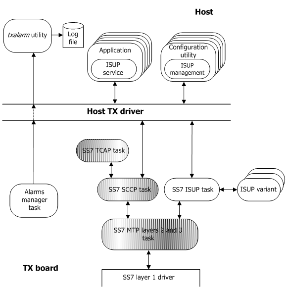TX alarms manager task that collects unsolicited alarms (status changes) generated by the SS7 tasks and forwards them to the host for application-specific alarm processing.