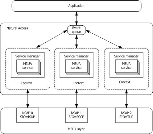 Natural Access organizes services and their associated resources around a processing object known as a context. Each instance of an application binding to an M3UA NSAP is a unique Natural Access context. Contexts are created with ctaCreateContext.