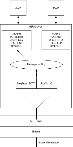 When an inbound message is received, M3UA finds a local peer server that matches the routing context in the received message. If the peer server is associated with an NSAP through a routing key, the message is routed over that NSAP to the appropriate M3UA user. In some error cases, such as a message received over an inactive association or with an invalid routing context, the message is discarded and an error message is returned to the sending side. In all other error cases, the message is discarded without generating a message.
