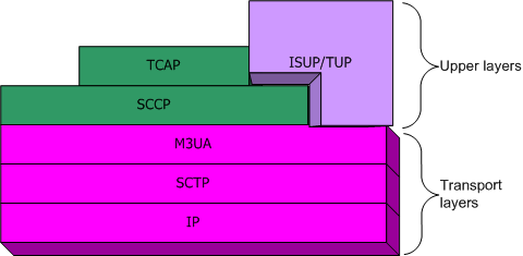 In an IP configuration, the SIGTRAN layers (IP, SCTP, and M3UA) are used as the transport layers for SCCP, TCAP, ISUP, and TUP.