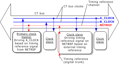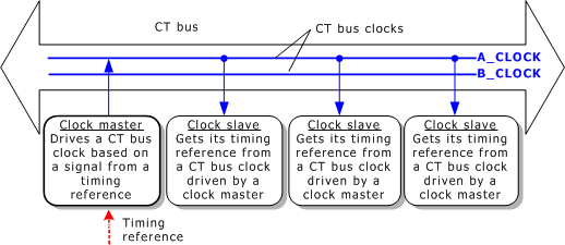 To drive its CT bus clock, a clock master takes a reference signal, extracts the frequency information, defines a phase reference at the extracted frequency, and broadcasts this information as A_CLOCK or B_CLOCK. This reference signal is called a timing reference. When you set up a clock master, you specify what source the board uses as its timing reference.