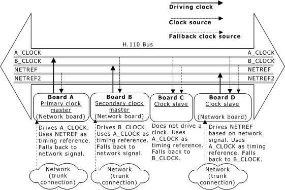 For example, if a clock master's primary timing reference source is a NETWORK signal from one of its trunks, the fallback timing reference source can be a NETWORK signal from another one of its trunks, or a signal from NETREF1, NETREF2 (if H.110), or OSC. In the following illustration, the fallback timing reference source is NETREF1: