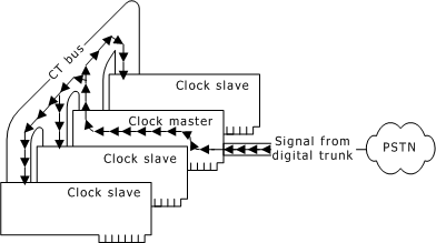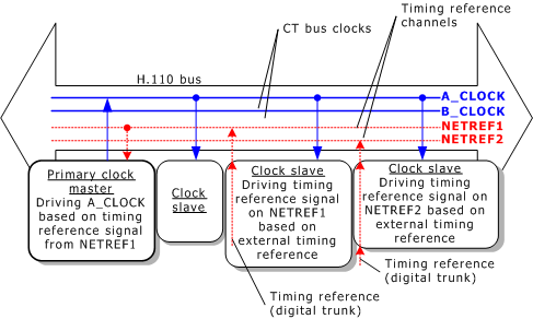 The primary clock master synchronizes with its primary network timing reference and drives the primary CT bus clock.