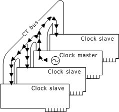 One board on the bus generates (drives) the clock. This board is called the clock master. All other boards use this clock as a timing reference by which they synchronize their own internal clocks. These boards are called clock slaves. The following illustration shows the clock master and clock slaves: