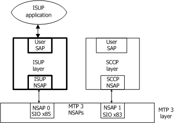 Define the interface between the ISUP layer and the MTP layer. NSAPs identify the MTP network SAP to be used by the ISUP layer, allowing multiple user parts (for example, ISUP and SCCP) to share access to the MTP layer services. |