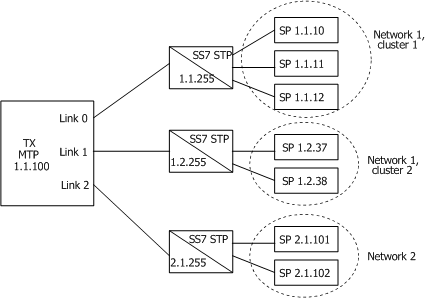 Use routing masks to implement network and cluster routing in ANSI networks. In the following example, rather than specifying explicit routes to each of the seven remote SPs, routing masks and routes are used. All point codes and routing masks, regardless of point code length, are stored internally as 32-bit unsigned integers. Routing masks are also useful when implementing server-type applications, such as service control points (SCPs), where it is impractical to preconfigure the point codes of all possible requester signaling points.