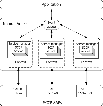 All events and messages from the SCCP service are delivered to the application through a Natural Access queue object. Queues are created with ctaCreateQueue. Each context is associated with a single queue through which all events and messages belonging to that context are distributed. More than one context can be assigned to the same queue.