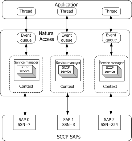 For multiple-threaded applications using multiple SCCP service access points (one per thread), a multiple-context, multiple-queue model is recommended (as shown in the following illustration). In this case, each thread has its own event loop and receives only the events associated with a service access point on its Natural Access queue.