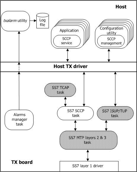 TX alarms manager task that collects unsolicited alarms (status changes) generated by the SS7 tasks and forwards them to the host for application-specific alarm processing.