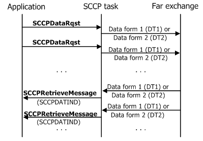 During the time that the call is connected, the application can exchange data with its peer in the far end point by invoking SCCPDataRqst or SCCPEDataRqst (expedited data). Incoming messages are signaled to the application with the SCCPDATIND or SCCPEDATIND indication events, as shown in the following illustration:
