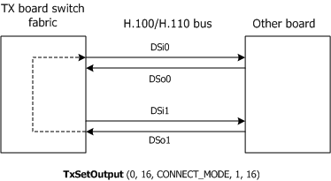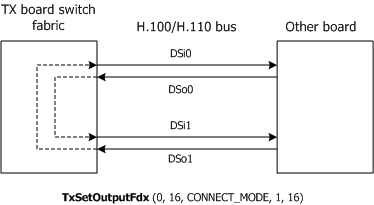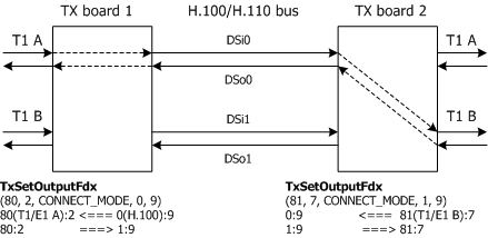 Establishes a connection between the specified source stream and timeslot and destination stream and timeslot. TxSetOutput sets up a half duplex connection in which data sampled from the specified source stream and timeslot is transmitted on the specified destination stream timeslot only. TxSetOutputFdx sets up a full duplex connection in which data sampled from the specified source stream and timeslot is transmitted on the specified destination stream timeslot. Data sampled for the destination stream and timeslot's corresponding input is transmitted on the specified source stream and timeslot's corresponding output. |