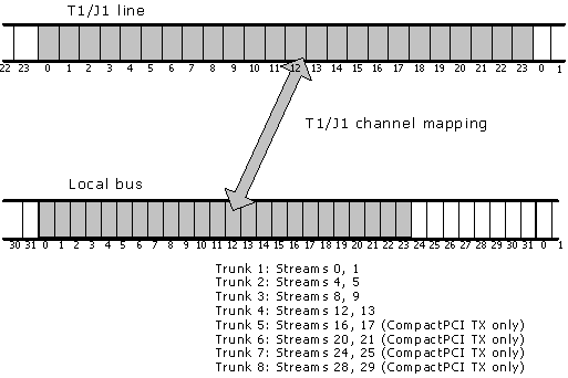Control access is provided for 24 T1/J1 channels (0 through 23). Each channel on the T1/J1 trunk is placed in a corresponding timeslot on the local bus in the following streams: