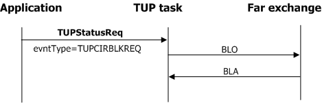 The application requests blocking of a circuit by invoking TUPStatusReq with the event type of TUPCIRBLKREQ. The application can consider the circuit blocked or unblocked when issuing this request. The following illustration shows how the application initiates a blocking request: