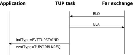 If the far exchange initiates the blocking of the circuit, the application receives a status indication (EVTTUPSTAIND) with the event type of TUPCIRBLKREQ from the TUP layer. The TUP task acknowledges the block for the application. The following illustration shows how a far exchange-initiated blocking request is conducted:
