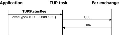If the far exchange initiates the unblocking of the circuit, the application receives a status indication (EVTTUPSTAIND) with the event type of TUPCIRUNBLKREQ from the TUP layer. The TUP task then acknowledges the circuit unblocking. The following illustration shows how a far exchange-initiated unblocking request is conducted: