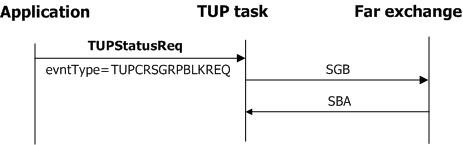 The application requests blocking of a circuit group by invoking TUPStatusReq with the event type of TUPCRSGRPBLKREQ. The application can consider the circuit group blocked or unblocked when issuing this request. The following illustration shows how the application initiates a group blocking request: