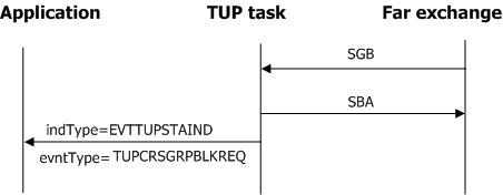 If the far exchange initiates the blocking of the circuit group, the application receives a status indication (EVTTUPSTAIND) with the event type of TUPCRSGRPBLKREQ from the TUP layer. The TUP task acknowledges the circuit group blocking. The following illustration shows how a far exchange-initiated group blocking request is conducted: