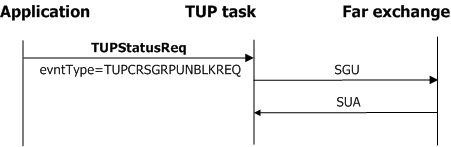 The application requests unblocking of a circuit group by invoking TUPStatusReq with the event type of TUPCRSGRPUNBLKREQ. The following illustration shows how the application initiates a group unblocking request: