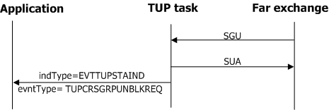 If the far exchange initiates the unblocking of the circuit group, the application receives a status indication (EVTTUPSTAIND) with the event type of TUPCRSGRPUNBLKREQ from the TUP layer. The TUP task then acknowledges the circuit group unblocking. The following illustration shows how a far exchange-initiated group unblocking request is conducted: