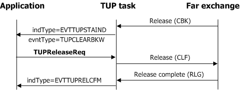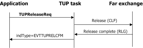 The application requests clearing the outgoing connection by invoking TUPReleaseReq. The application is notified of the completion of the release procedure (the receipt of a release complete message) when it receives a TUP release confirm (EVTTUPRELCFM) event. The following illustration shows the process by which the application performs outgoing connection release: