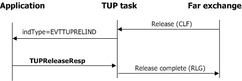 If the far exchange initiates the release of the outgoing connection, the application receives a TUP release indication event from the TUP layer. The application then completes the connection release by invoking TUPReleaseReq to send the release message to the far exchange and wait for the TUP release confirm (EVTTUPRELCFM) event. The following illustration shows the process by which far exchange connection release for outgoing connections occurs: