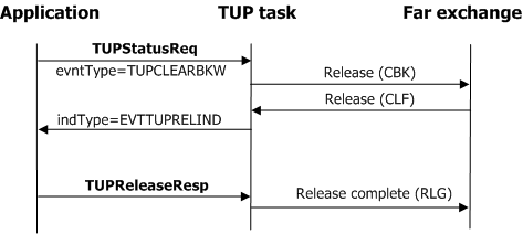 To clear an incoming connection, the application starts with TUPStatusReq and waits for TUPReleaseInd to return. The application can then answer with TUPReleaseResp. The following illustration shows the process by which the application performs incoming connection release: