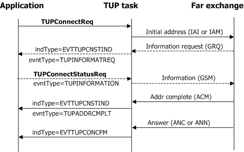 The application initiates a circuit switched connection by invoking TUPConnectReq resulting in the generation of a TUP initial address message (IAM or IAI) to the far exchange. The far exchange can initiate the connection by sending the IAM or IAI message. The application receives a TUP connect indication (EVTTUPCONIND) event. The following illustration shows the process for establishing outgoing connections (where dashed lines indicate optional sequences):