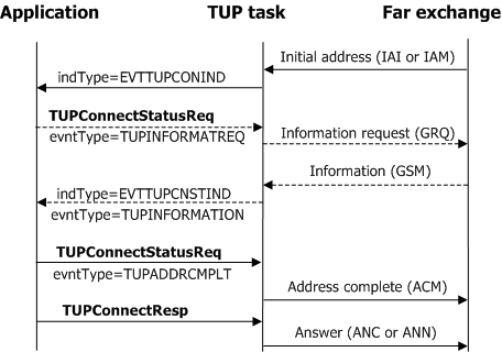 During the connection establishment phase, the application exchanges call progress and other status information with the far exchange by invoking TUPConnectStatusReq with an event type and by receiving TUP connect status indication (EVTTUPCNSTIND) events from the TUP task. The following illustration shows the process for establishing incoming connections (where dashed lines indicate optional sequences):
