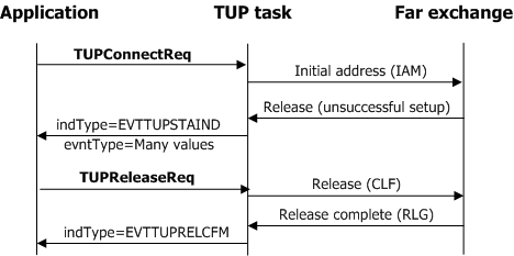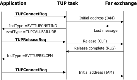 If an intelligible answer to the initial address message (IAM) is not received, TUPConnectReq can fail. The following illustration shows how events are generated and how cleanup occurs (before a reconnection is attempted) when a connection fails because there is an unknown or missing response: