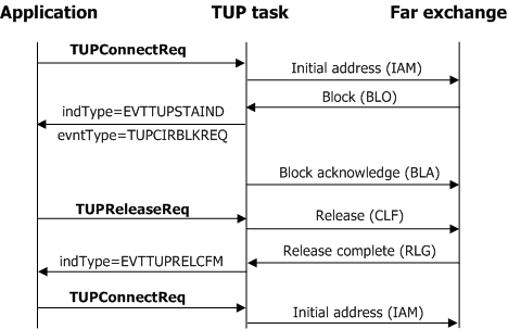 If the far exchange blocked the circuit, TUPConnectReq can fail. The following illustration shows how events are generated and how cleanup occurs (before a reconnection is attempted) when a connection fails because the circuit is blocked: