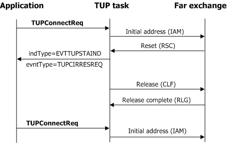 If the far end exchange resets the circuit, TUPConnectReq can fail. The following illustration shows how events are generated and how cleanup occurs (before a reconnection is attempted) when a connection fails because the circuit has been reset: