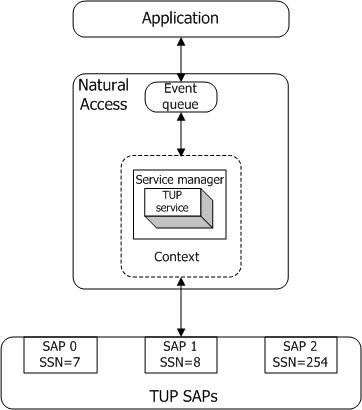 All events and messages from the TUP service are delivered to the application through a Natural Access queue object. Queues are created with ctaCreateQueue. Each context is associated with a single queue through which all events and messages belonging to that context are distributed. More than one context can be assigned to the same queue.