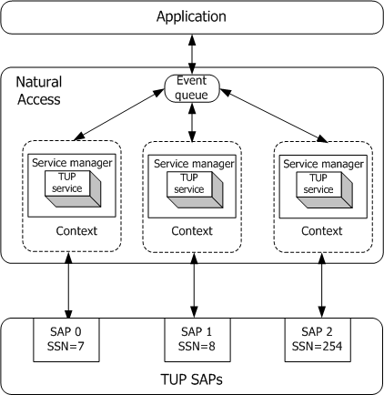 For multiple-threaded applications using multiple TUP service access points (one per thread), a multiple-context, multiple-queue model is recommended. In this case, each thread has its own event loop and receives only the events associated with a service access point on its Natural Access queue.