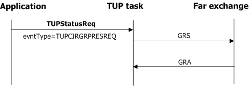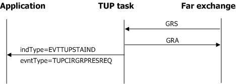 If the far exchange initiates the reset of the circuit group, the application receives a status indication (EVTTUPSTAIND) with the event type of TUPCIRGRPRESREQ from the TUP layer for the circuit group. The application can consider these circuits reset upon receiving this indication. The TUP task acknowledges the group reset request by sending a group reset acknowledgment message (GRA). The following illustration shows the process by which a far exchange-initiated group reset request is conducted: