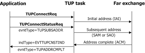After calling TUPConnectReq, the application can send subsequent address messages (SAM or SAO) with TUPConnectStatusReq. The far exchange generates an address complete message when the address is complete. The application must wait for a TUPStatusInd after sending the last SAM or SAO. The following illustration shows the process by which the application performs subsequent address connection establishment: