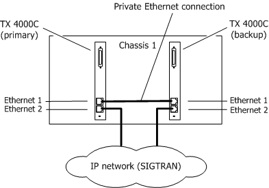 The following illustration shows how to set up two TX 4000C boards based on a single-node signaling server in an IP network configuration. The boards are located in the same chassis to ensure board-level redundancy.